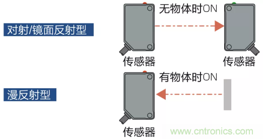 對射型/鏡反射型傳感器有物體時輸出ON;漫反射型傳感器無物體時ON
