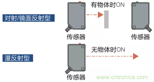 對射型/鏡反射型傳感器無物體時為ON;漫反射型傳感器有物體時為ON