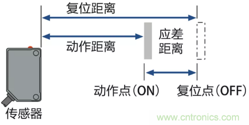 檢測物從遠到近靠近傳感器直到輸出變為ON的位置為動作距離,從此位置往外移動直到輸出變為OFF的位置為復位距離。應差距離=復位距離-動作距離