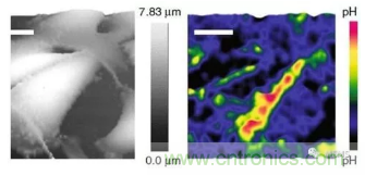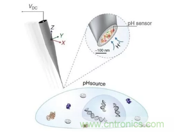 目前,最常用的pH探針基于微電極,與細胞外pH研究中pH值波動范圍相比,微電極體積較大。替代方案包括基于分子熒光的變化,核磁共振成像以及正電子發射計算機斷層掃描。然而,熒光監測易受背景噪音和光漂白的影響,其他技術的空間分辨率較差,并且由于其基于探針在組織內的分布而難以定量。