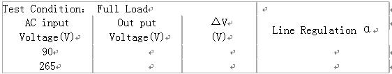 (1)交流輸入電壓90V,160V,220V,265V,輸出電流為100%Io,30%Io,空載時,測出對應的穩(wěn)定的直流輸出電壓值Uo與對應的交流輸入功率Pin。