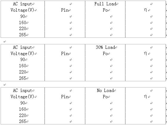 1.內容:測試不同交流輸入電壓,不同負載條件下電源效率η