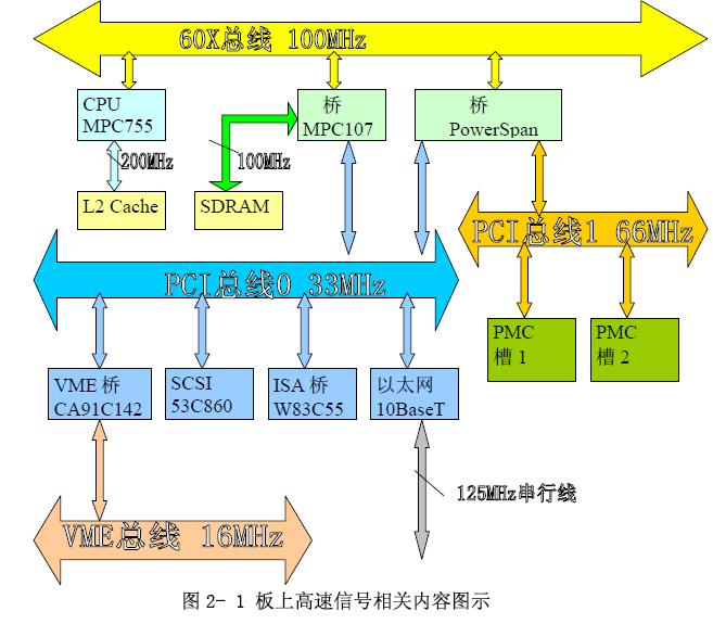 我們設計的是基于PowerPC的主板,主要由處理器MPC755、北橋MPC107、北橋PowerSpanII、VME橋CA91C142B等一些電路組成,上面的高速信號如圖2-1所示。