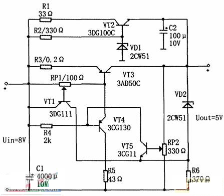 當輸出電壓增大時,三極管VT5基極偏壓減小,其集電極電流減小,電壓升高,從而引起三極管VT4基極電壓升高,電流減小,其發射極(即調整管VT3基極)電壓升高,電流減小,VT3管壓降Uce3增大,這樣就使輸出電壓降低,達到穩壓的目的。輸出電壓可以通過調節電位器RP2加以改變。
